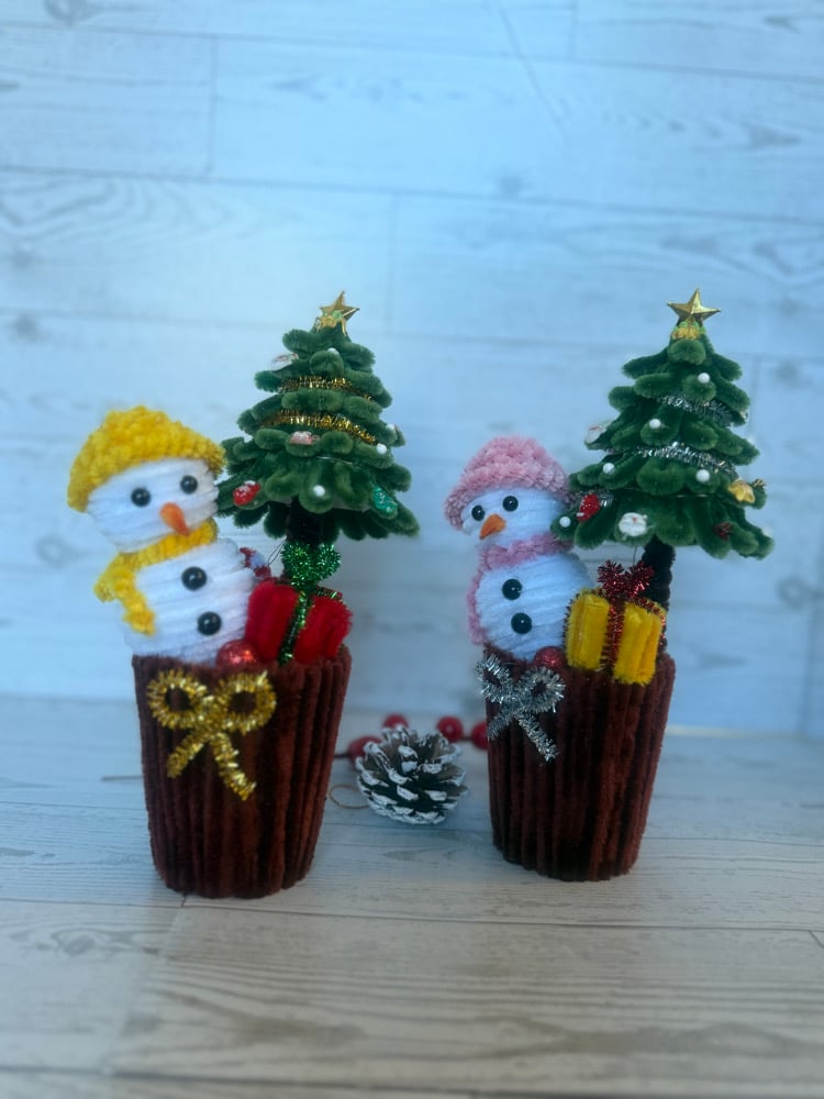 Cute Handmade Christmas Cup DecorAdorable pipe-cleaner snowmen peek out from decorated mini Christmas trees, all set in a festive cup filled with tiny presents and a glittery bow. Perfect for adding cheerful holiday charm to any small space or gifting during the season.