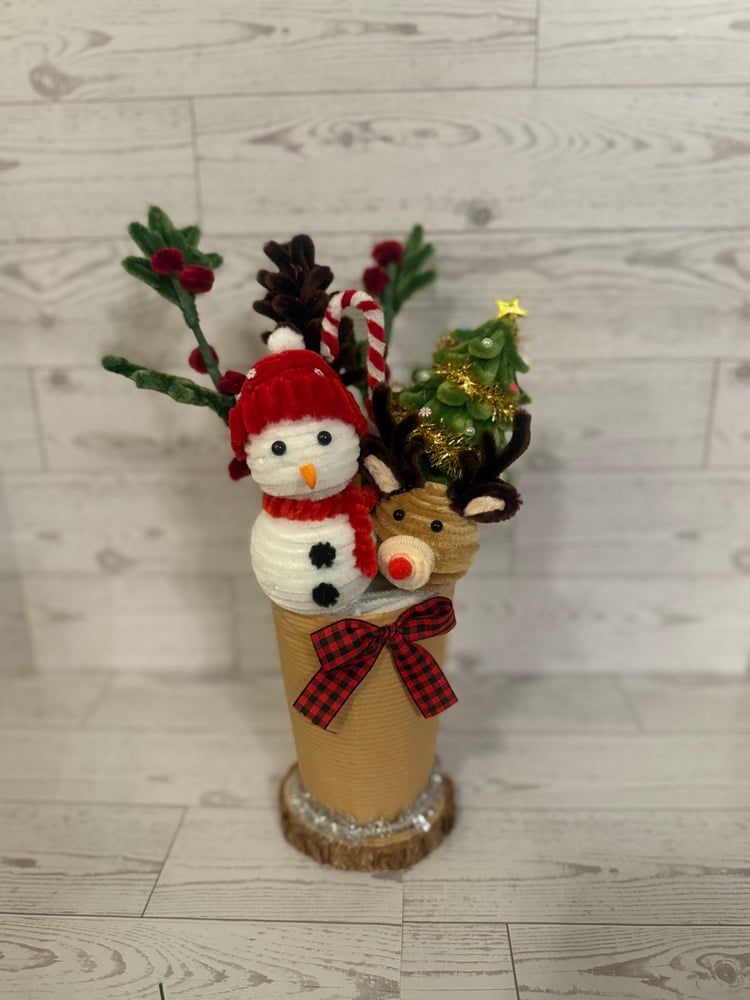Add festive charm to your home with this Rustic Christmas Friends Arrangement! Featuring a cozy snowman, cheerful reindeer, and mini-Christmas tree in a wood look base with a plaid bow - a delightful touch of holiday warmth for any space.