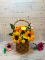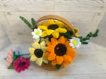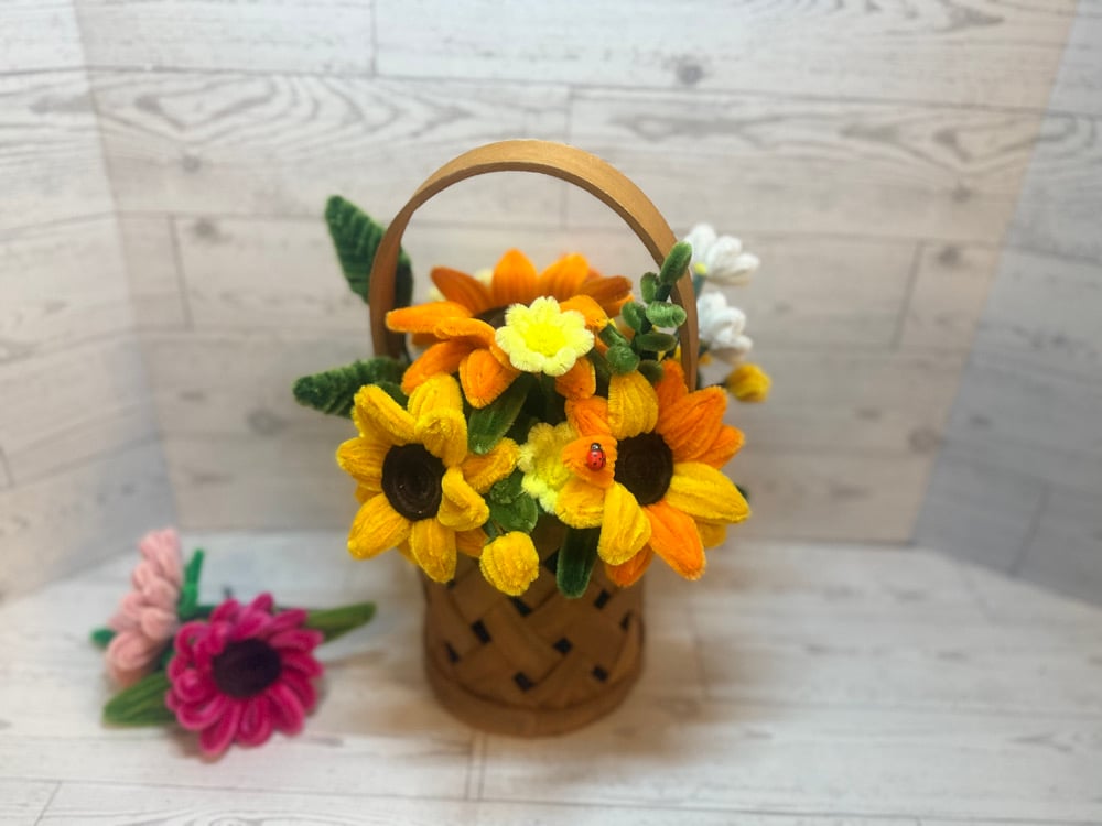 Brighten any space with this charming handmade sunflower basket! Each bloom is crafted from soft, colorful chenille stems, shaped with care to create a cheerful mix of sunflowers, daisies, and lush greenery. Nestled inside a woven mini basket, this arrangement adds a sunny pop of color to desks, shelves, and gift displays without ever needing water.